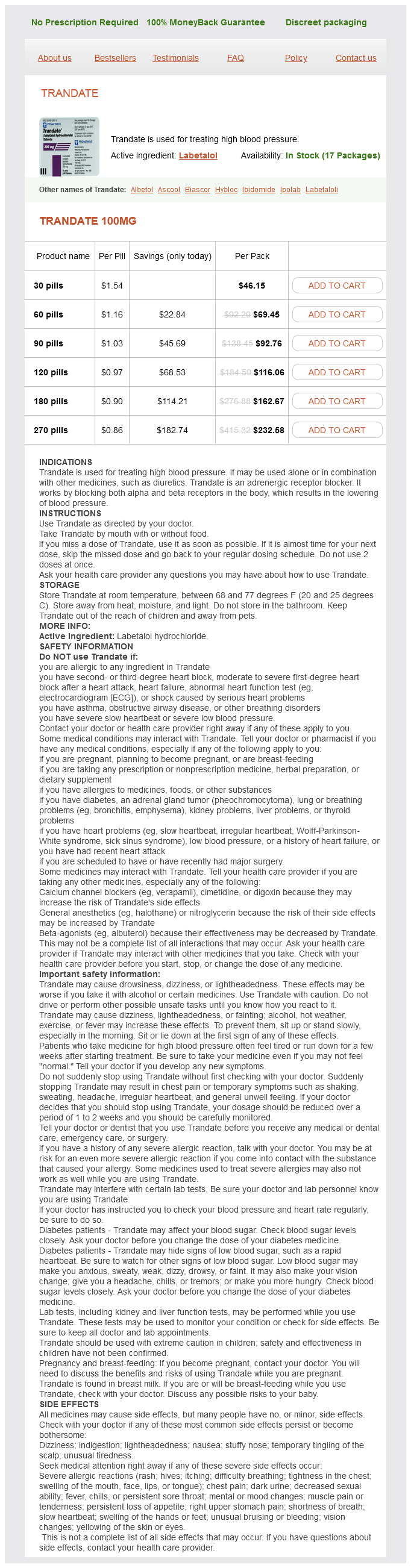 The specimen is submitted to pathology for frozen section evaluation to exclude malignancy pulse pressure def cheap labetalol 100 mg buy line. Reconstruction utilizes a 4050 cm defunctionalized Roux limb of jejunum that is passed through the transverse mesocolon into the supracolic compartment blood pressure medication make you feel better buy generic labetalol on line. A duct-to-mucosa pancreaticojejunostomy is constructed using a two-layered handsewn technique at the neck margin to the end of the jejunum prehypertension spanish cheap generic labetalol uk. A long enterotomy is made on the side of the jejunum contralateral to the first anastomosis heart attack upper back pain order labetalol 100 mg line. The pancreatic margin is then sewn to the enterotomy to construct a second pancreaticojejunostomy blood pressure top number high labetalol 100 mg buy without prescription. If the distal common bile duct is inadvertently entered during excavation of the pancreatic head, it can be unroofed and allowed to drain laterally into this second anastomosis. The Berne modification was developed to avoid complete division of the pancreatic neck anterior to the portal vein. Frey procedure the Beger procedure does not address disease that may coexist in the body and tail of the pancreas. For patients with fibroinflammatory pancreatic head mass associated with a large duct disease due to pancreatic duct stricture and intraductal stones, a combined resection and drainage procedure developed by Frey may be applicable. This technique combines duodenumpreserving pancreatic head resection with longitudinal pancreaticojejunostomy. In this procedure, the pancreas is fully exposed along its length from head (via Kocher maneuver) to tail (via extended opening of the lesser sac). The initial steps to excavate the pancreatic head are performed similar to the Beger and Berne procedures, sometimes including cholecystectomy and cannulation of the cystic duct. After excavation of the pancreatic head, the main pancreatic duct is unroofed longitudinally to the tail using electrocautery. Izbicki and colleagues described a related approach sometimes termed the Hamburg procedure to treat patients with an inflammatory head mass with extensive small duct fibroinflammatory disease (<3 mm) in the body and tail of the pancreas. In this operation, the body and tail are unroofed by a V-shaped wedge and then enterically drained via lateral pancreaticojejunostomy as in the Frey procedure. Results of clinical trials There have been several small randomized control trials from Europe that have compared these techniques. One study compared 20 patients treated with the Beger procedure to 20 patients treated with pylorus preserving pancreaticoduodenectomy. The only difference in quality of life measurements was a higher incidence of appetite loss after pancreaticoduodenectomy. Nonreplacement treatment of chronic pancreatitis review of studies comparing the Beger procedure to pancreaticoduodenectomy concluded that length of stay may be shorter in for patients treated with the Beger procedure, but the overall quality of the evidence is insufficient to detect meaningful differences in mortality, adverse events, or quality of life. The study compared 31 patients treated by Frey procedure and 30 patients by pancreaticoduodenectomy with 7-year follow-up. Because the clinical trials performed to date are small and highly variable with respect to design, surgical approach, inclusion criteria, and endpoints, no expert consensus has yet emerged. In general, the choice of operation should continue to use preoperative imaging to define the anatomic circumstances. Patients with a dominant fibroinflammatory head mass without main pancreatic duct dilatation or biliary obstruction and no suspicion of malignancy are candidates for either pancreaticoduodenectomy or duodenum-preserving pancreatic head resection by the Beger procedure or Berne modification. For patients with a dominant head mass and a dilated main pancreatic duct, pancreaticoduodenectomy or Frey procedure are reasonable options. Patients with intractable pain despite optimal nonoperative and endoscopic measures, or where there is concern for malignant transformation, can undergo surgical resection or drainage procedures that are tailored to the specific anatomic distribution of disease. Although some patients achieve a long-term pain relief and sustained improvement in quality of life, the outcome of traditional surgical approaches to chronic pancreatitis also remains variable, unpredictable, and often suboptimal. The clinical and radiological characteristics of focal mass-forming autoimmune pancreatitis: comparison with chronic pancreatitis and pancreatic cancer. Prospective evaluation of the diagnostic accuracy of secretin-enhanced magnetic resonance cholangiopancreaticography in suspected chronic pancreatitis. Effect of cessation of alcohol use on the course of pancreatic dysfunction in alcoholic pancreatitis. Beyond abdominal pain: pain beliefs, pain affect, and distress as determinants of quality of life in patients with chronic pancreatitis. Ameliorating effect of antioxidants and pregabalin combination in pain recurrence after ductal clearance in chronic pancreatitis: results of a randomized, double blind, placebo-controlled trial. Conclusion Chronic pancreatitis is a progressive fibroinflammatory process often associated with chronic pain that leads inexorably to exocrine and endocrine insufficiency. A multidisciplinary approach and early diagnosis are key to effective and durable treatment results. Patients should be managed initially with lifestyle modification, pancreatic enzyme supplementation, and a judicious stepwise approach to pharmacologic relief of pain. Some patients are amenable to therapeutic endoscopic intervention, and while recent years have seen substantial innovation and improvement in technology, the results endoscopic intervention are mixed, with frequent incom