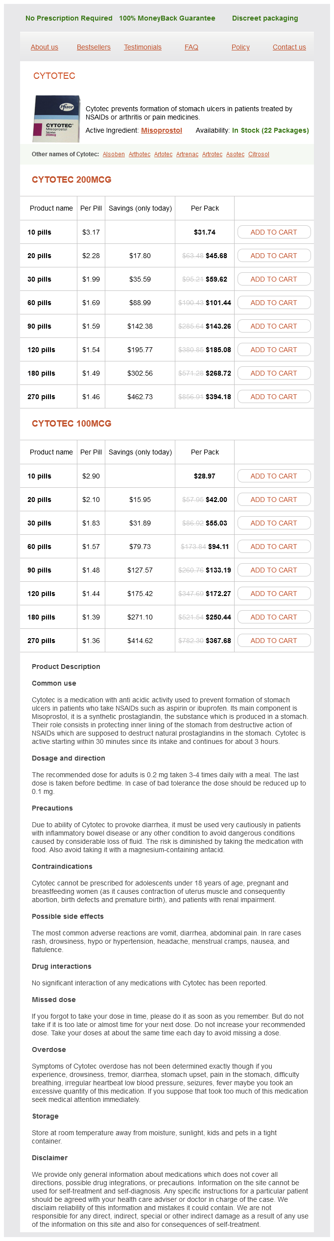 Hyperplasia of the intraepithelial goblet cells occurs at the expense of ciliated cells in the lining epithelium gastritis pain treatment order 200 mcg misoprostol with mastercard. If the exacerbation is severe gastritis diet öåíà 200 mcg misoprostol order free shipping, the patient may deteriorate rapidly and require hospitalization gastritis diet book discount misoprostol. Grade 1 2 3 Degree of breathlessness related to activities Not troubled by breathlessness except on strenuous exercise Short of breath when hurrying or walking up a slight hill Walks slower than contemporaries on level ground because of breathlessness xanthomatous gastritis discount 100 mcg misoprostol with mastercard, or has to stop for breath when walking at own pace Stops for breath after walking about 100 metres or after a few minutes on level ground Too breathless to leave the house eosinophilic gastritis definition cheapest misoprostol, or breathless when dressing or undressing 4 5. This state is known as respiratory failure and is discussed in more detail elsewhere. In order to receive the benefits of long-term oxygen therapy, patients should breathe supplemental oxygen for at least 15 hours per day. In patients who become hypercapnic or acidotic on long-term oxygen therapy, regular non-invasive ventilation must be considered  this requires referral to a specialist centre. Pulmonary rehabilitation normally occurs in an outpatient setting with a multidisciplinary team. If introducing a long-acting anticholinergic (tiotropium), then short-acting cholinergic inhalers (ipratropium) need to be stopped. Inhaled corticosteroids are only used in combination with a long-acting b2 agonist and never alone. They have been shown to reduce the frequency of exacerbations as well as the risk of pneumonia. Commonly reported symptoms are worsening breathlessness, cough, increased sputum production and change in sputum colour. The severity of an exacerbation is assessed using the following tests: · Blood: evidence of a raised white cell count and C-reactive protein indicates the presence of infection. Management includes: · Controlled oxygen to maintain oxygen saturations between 88 and 92%; this is normally achieved with a Venturi mask. If patients have received multiple courses of steroids they will require a reducing-dose regimen to avoid rebound exacerbations when the steroids are stopped. Long-term domiciliary oxygen therapy in chronic hypoxic cor pulmonale complicating chronic bronchitis and emphysema. Aetiology is variable but they all present in a similar fashion, typically with shortness of breath and chestX-ray shadows. Though separately each disease is rare, collectively they affect 1/2000 of the population. The end stage is characterized by a honeycomb lung, a non-specific condition in which cystic spaces develop in fibrotic lungs with compensatory dilatation of unaffected neighbouring bronchioles. Clinical features Patients become progressively breathless and develop a dry, non-productive cough. On examination, lung expansion is reduced and fine end-inspiratory crackles are heard. Investigations Chest X-ray may show fine reticular, nodular or reticulonodular infiltration in the basal areas. Biopsy may be used to aid diagnosis; however, this can be difficult in older patients, who may not be suitable for surgery. Furthermore, there can be considerable differences in the interpretation of histological specimens. Lung function tests demonstrate a restrictive pattern along with a decreased transfer factor and can help monitor the progression of the disease. Pathogenesis the pathogenesis of pulmonary fibrosis is complex, involving many factors. The main features are: · A lesion affecting the alveolar-capillary basement membrane. Soluble immune complexes Sensitized alveolar T lymphocyte Complement components C3a, C5a Lymphokines Activated macrophage Interleukin-8 Treatment Treatment for pulmonary fibrosis is variable, depending on the underlying cause. Any underlying triggers or stimuli should be avoided as much as possible, 158 the pneumoconioses although this may not be practical. The changes seen in pulmonary fibrosis are largely irreversible and there are no definitive treatments. However, there are numerous side-effects to long-term oral steroid treatment, such as osteoporosis and development of cushingoid features. N-acetylcysteine has been shown in some trials to improve outcomes; however, the evidence is not conclusive. There is very little evidence that inhaled therapies such as salbutamol have any benefit. When patients develop severe pulmonary fibrosis which is unresponsive to medical therapy, home oxygen therapy may be necessary, progressing to long-term oxygen therapy. Distribution of lung disease depends on the dust involved: particles measuring less than 2Â3 mm in diameter reach the distal alveoli. Two syndromes exist: simple pneumoconiosis and an advanced form, progressive massive fibrosis. The Coal Workers Pneumoconiosis Scheme has been set up specifically for this purpose. Although not all claims are successful, many patients are able to get some compensation for the disease that they have subsequently developed. These patients should be managed in the same way as all other patients in acute respiratory failure (see Ch. Worsening or first presentation of severe pulmonary fibrosis can be treated initially with intravenous corticosteroids, with cyclophosphamide as second-line therapy. Assessment by an intensive care physician should also be made and decisions about ceiling of care discussed with the patient. One must also consider other diagnoses associated with the underlying cause of the pulmonary fibrosis. This is particularly important in those with asbestosis, as they are at risk of mesothelioma. Simple pneumoconiosis Simple pneumoconiosis is the commonest type of pneumoconiosis, reflecting coal dust deposition within the lung. It is asymptomatic and diagnosis is made on the basis of small ro
