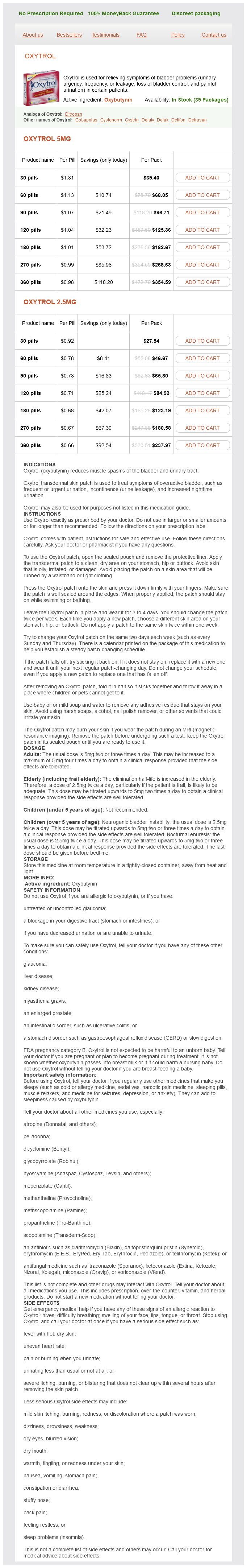 A metaanalysis of epidural labor analgesia compared with nonepidural or no analgesia did not identify a difference in the risk for perineal trauma requiring suturing medications you cant take with grapefruit purchase oxybutynin 5 mg with visa. However symptoms after embryo transfer buy oxybutynin 2.5 mg on line, to our knowledge symptoms wheat allergy buy 5 mg oxybutynin, there is no evidence that epidural analgesia per se predisposes to pelvic floor injury treatment 20 buy oxybutynin from india. Controversy exists as to whether there is a cause-and-effect relationship between the use of these analgesic techniques and prolonged labor or operative delivery medications and pregnancy order generic oxybutynin canada. The understanding of this subject has been limited by the difficulty of performing controlled trials in which parturients are randomly assigned to neuraxial analgesia or a control group. Ideally, if one wants to study the effect of neuraxial analgesia on the progress and outcome of labor, the control group would receive no analgesia. However, such a study is not ethical, and even if it were and women volunteered to participate in it, the crossover rate would probably be high and the data consequently would not be interpretable. Therefore, controlled trials have randomly assigned parturients to receive neuraxial analgesia or an alternative form of pain relief, usually systemic opioid analgesia. However, even when the control group receives some type of analgesia, the crossover rate may be high because the quality of neuraxial analgesia is markedly superior to that of all other modes of labor analgesia. The investigators made the following comments389: Of 245 selected patients, 43 had to be removed from the trial after labour ensued. Most of the patients removed from the non-epidural group were apparently experiencing severe pain; they were usually primigravidae whose baby presented in the occipito-posterior position. The majority of patients removed from the epidural group were apparently normal and usually multigravidas; their labours were so rapid it was not possible to arrange for an epidural block. In other words, patients at low risk for operative delivery were excluded from the epidural group, and patients at high risk were excluded from the nonepidural group. Women who agree to participate in research trials may be inherently different from women who refuse to participate. Many women make a decision regarding labor analgesia well before the onset of labor and are unwilling to let chance randomization determine the type of labor analgesia. Thus, the study results may not be generalizable to the general obstetric population. Ironically, the effect of systemic opioids on the progress and outcome of labor has not been well studied. Conclusions about the effect of one technique on the progress of labor may not be applicable to other techniques (see later discussion). This is not possible for studies that compare neuraxial analgesia with another mode of analgesia, because of the marked difference in the quality of analgesia. Therefore, the potential for bias on the part of the parturient, nurses, and anesthesia and obstetric providers is substantial. Additionally, a number of factors are known to affect or to be associated with the progress and outcome of labor, including parity, artificial rupture of membranes, use of oxytocin, and payer status; these factors should be controlled in well-conducted studies. One factor known to markedly influence the outcome of labor is the obstetric provider. Five percent of patients in the clinic group and 17% of patients in the private group underwent cesarean delivery (P <. More striking was the difference between groups in the incidence of cesarean delivery for dystocia (0. Similarly, Guillemette and Fraser392 observed marked obstetrician variation in cesarean delivery rates, despite similarities in the use of oxytocin and epidural analgesia. Several groups of investigators have noted that the timing of cesarean delivery conforms to a "circadian" rhythm. In some cases, distinguishing between anesthesia administered for pain relief during labor and anesthesia administered in preparation for operative delivery is difficult. During the latent phase, higher levels of pain were predictive of longer latent and active phases of labor. Those women who reported "horrible" or "excruciating" pain during the latent phase were more than twice as likely to require instrumental delivery as women who only had "discomfort. Greater pain intensity during labor appears to be a risk factor for operative delivery. This fact will significantly bias observational studies of labor analgesia because women with greater pain intensity request analgesia, specifically neuraxial analgesia, at a higher rate than women with less intense pain. The rate of cesarean delivery for dystocia was 14% in women who self-administered 50 mg/h or more of meperidine, compared with 1. In a retrospective study of factors that predict operative delivery in laboring women, Hess et al. These findings may explain the observed association between neuraxial analgesia and operative delivery. Four prospective, randomized trials were performed at the University of Texas Southwestern Medical Center, Parkland Hospital, in Dallas. In the first study, 1330 women of mixed parity were randomly assigned to receive either epidural bupivacaine/fentanyl or intravenous meperidine for labor analgesia. However, the investigators did not report an intention-to-treat analysis of these data; thus, it was unclear whether there was a higher incidence of cesarean delivery in the women randomly assigned to the epidural analgesia group. Subsequently, the investigators published a re-analysis of the data that included an intention-to-treat analysis (Table 23. These analyses support the conclusion that women who choose epidural analgesia have an inherent risk factor(s) for cesarean delivery and that the administration of